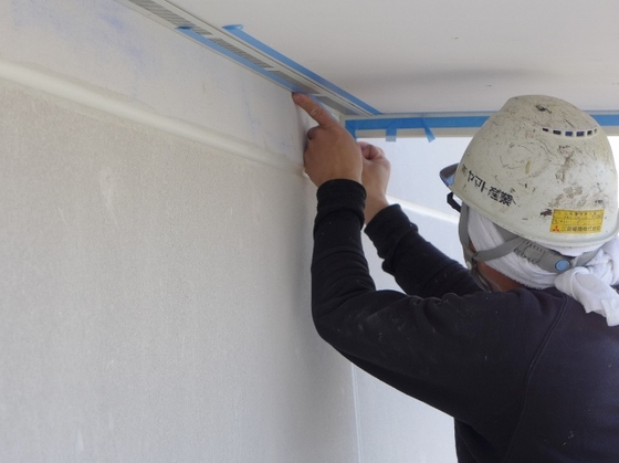 外壁と軒天の取り合いコーキング。一部網目になっているのは軒裏換気。