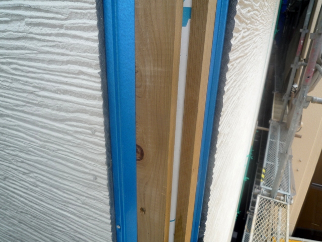継ぎ目(ブルーのライン)は目地棒(ジョイナー)といいまして 外壁を貼る前に取り付け。