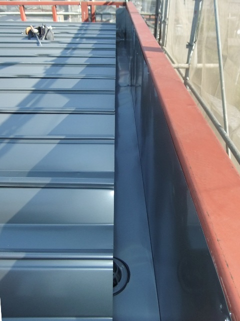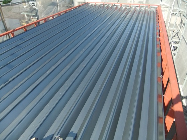 静岡市葵区本通で鉄骨3階建て住宅の屋根板金工事施工の様子