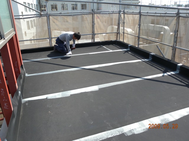 バルコニーや屋上の防水の方法はいろいろありますが、今回は鉄骨の建物ですから「シート防水」を施しました。