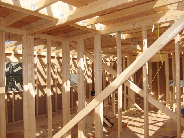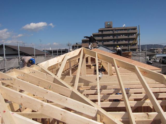 静岡市駿河区西脇 I 様邸新築現場 屋根組み、防水シートを貼って雨に備えます