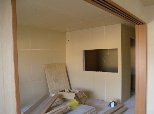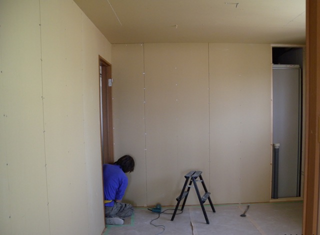 窓枠や内部建具の枠も付きまして・・・プラスターボード貼りも中盤です。