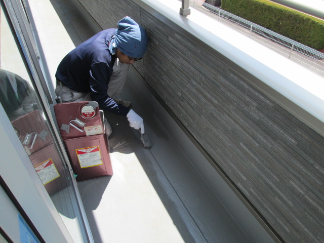 富士市伝法でベランダ防水工事、トップコートを塗っています