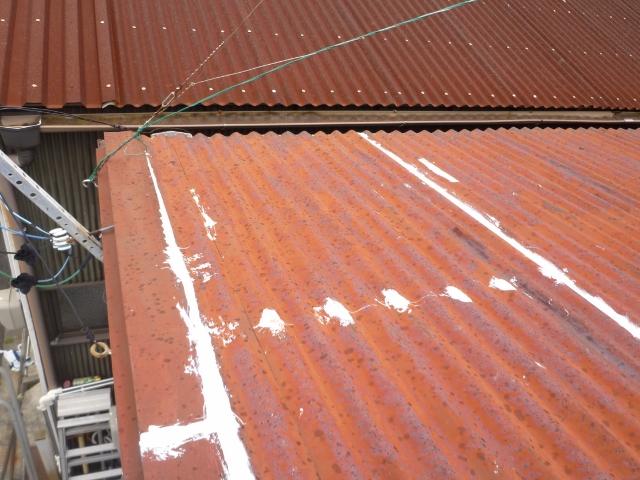 そして屋根材を留めていたビス穴を塞ぐ補修(点在する白い部分です)や、屋根材の境目にも補修をしたような痕跡がみられますね。