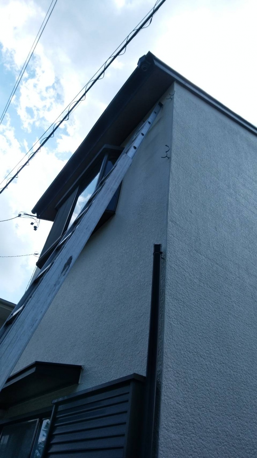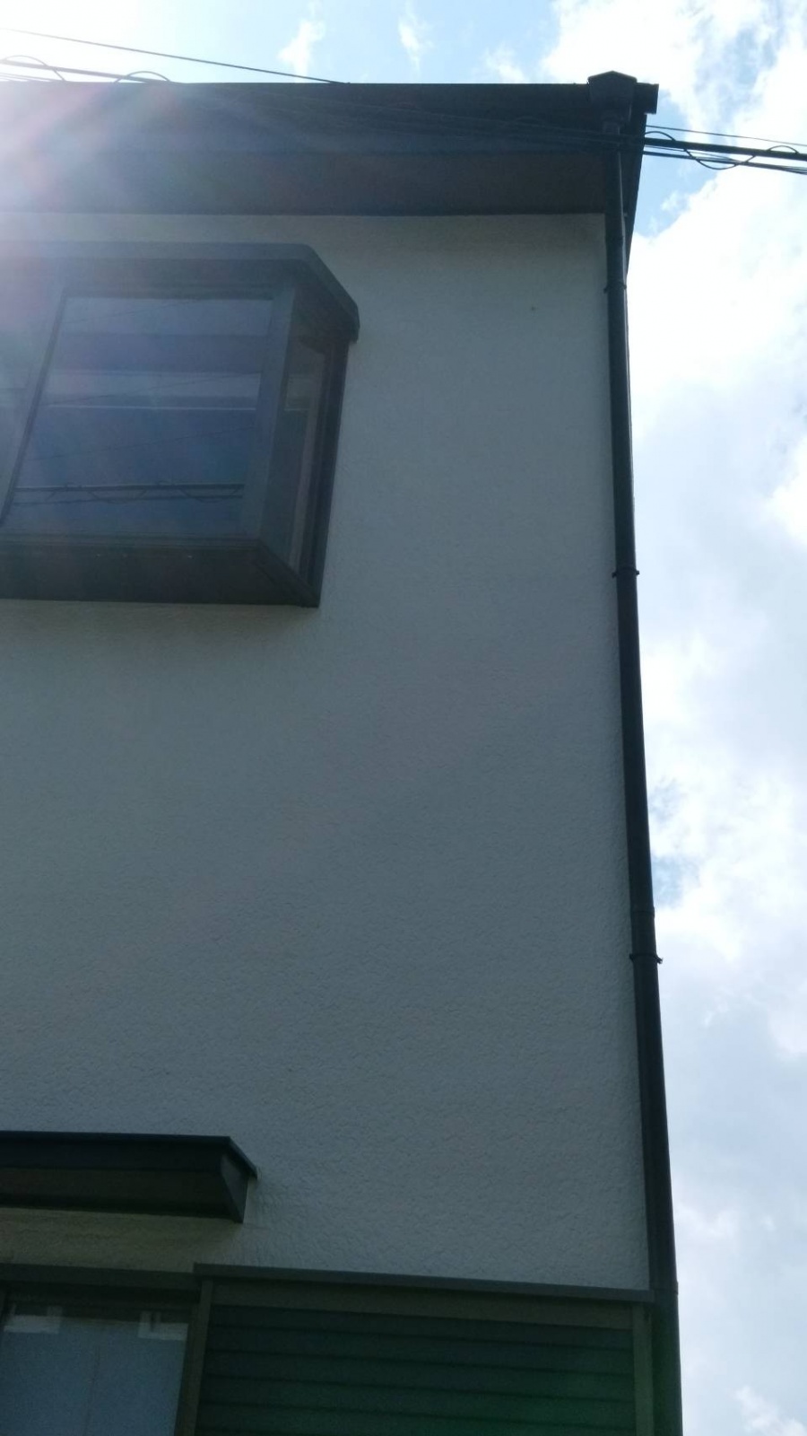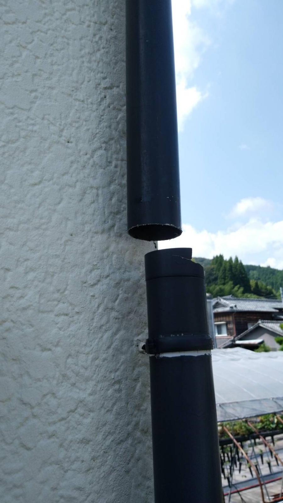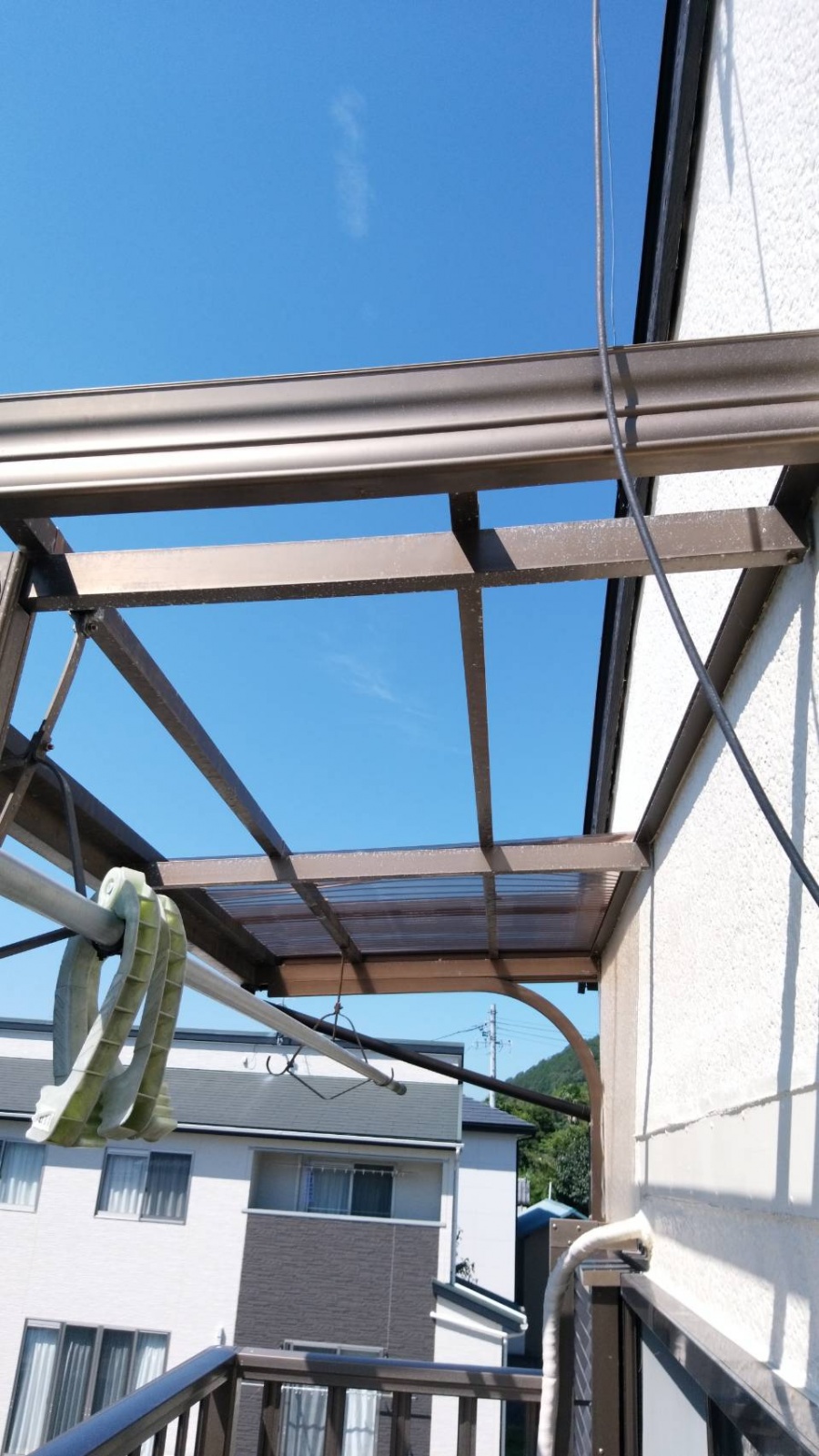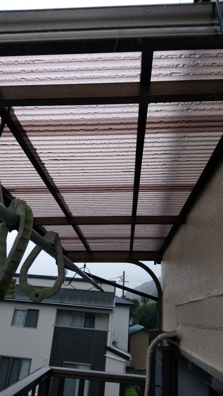 葵区羽鳥本町 台風のような強い雨風で ベランダの屋根と竪樋が破損