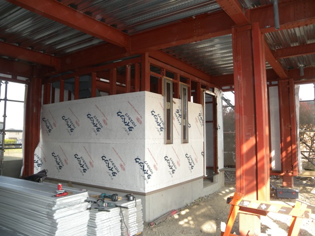 透湿防水シートで覆って防水層を作り、その上に外壁材を貼っていきます。