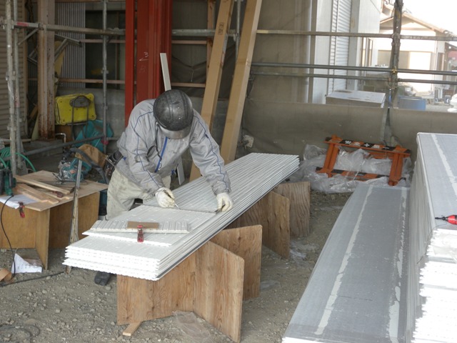 2階、3階部分は仮設足場を利用して荷揚げして施工。