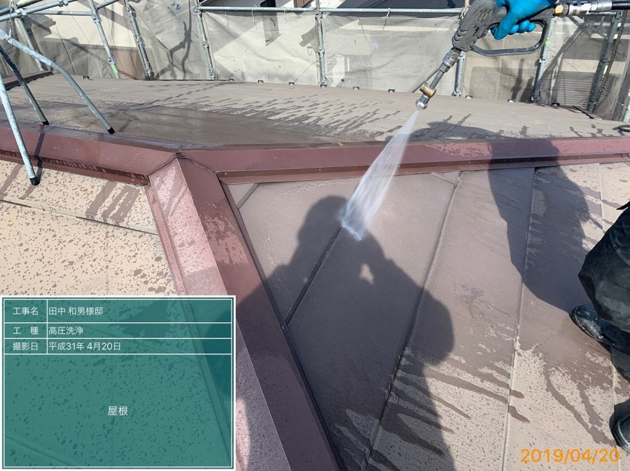 ホーム > 川越市でガルバリウム鋼板の屋根塗装で高圧洗浄の様子のご紹介で…