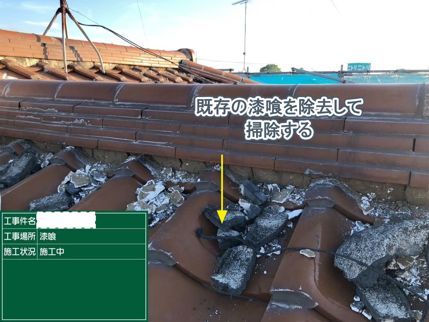 漆喰の詰め直し工事は既存の漆喰をきれいに除去する事が大事です!漆喰が残っている上から新たに詰めてしまうと剥がれやすくなってしまいます(>_<)中の土が出てくるまで漆喰を取り除いて新しく詰めなおしていきます☆