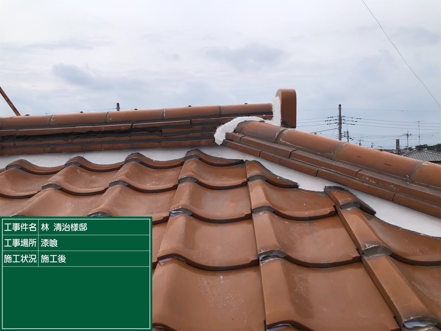 劣化した漆喰の詰め直し工事を行っていきます!棟瓦を支えている漆喰は、日差しや雨風に晒されることによって10年程でひび割れて劣化していきます(>_<)漆喰が劣化しまうと棟瓦の固定力を失うので、地震や強風などで棟瓦がズレる原因となります!棟瓦がズレたり落ちたりしている場合は、棟を一から積み直す「棟瓦の積み直し工事」を行いますが、今回は棟瓦にズレや曲がりはなかったので漆喰の詰め直し工事です(^^)/