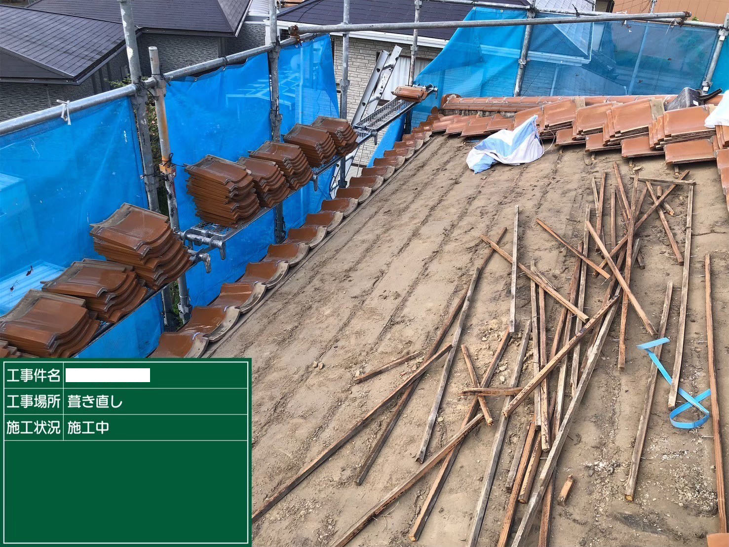 瓦を撤去して劣化した防水シートと瓦桟木を撤去していきます(^^)/葺き直し工事では瓦は再利用するので割らないように丁寧に積んでおきます☆