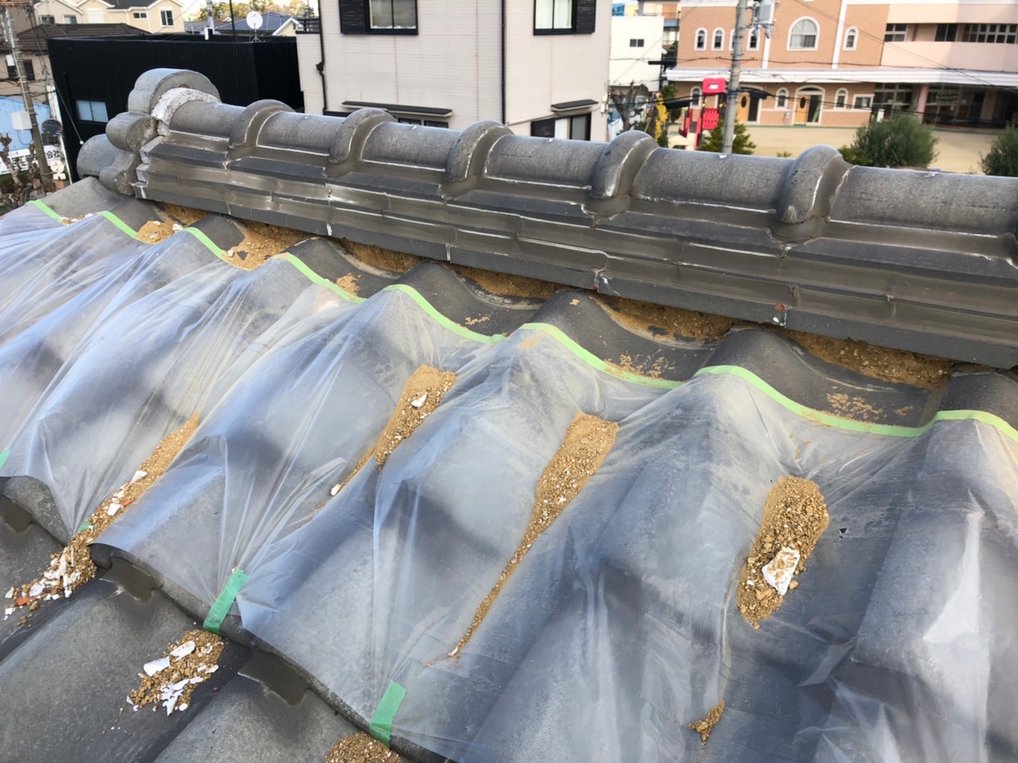 ある日のこと、お客様のご自宅にリフォーム会社の営業マンが訪問。その人の話では屋根の棟部分の漆喰が剥がれているとの話をされたとのこと。更に、その営業マンが言うには、そのまま放置していると屋根の状態が悪化してしまい、悪い場合には雨漏りにも繋がる…という話をされたとのことでした。そこで、屋根のリフォーム会社をネットで探してみたところ、当社ホームページを見つけてくださり、連絡をいただいたのが工事のきっかけです。