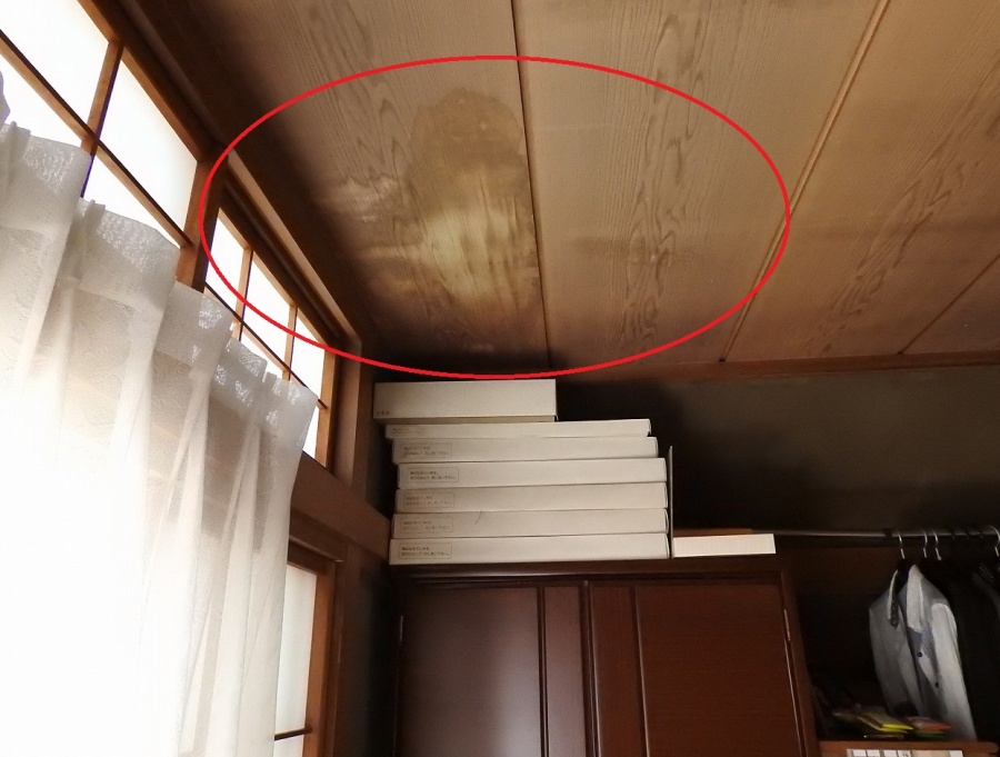 窓の上の天井に雨漏り跡がくっきりと残っております。
