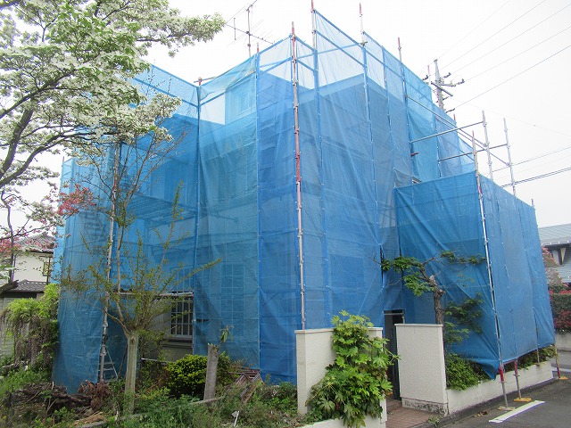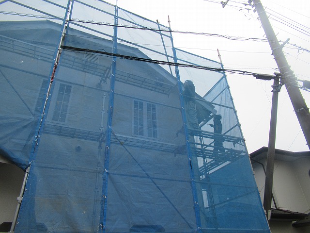 近隣には、足場にメッシュシートがついているため、ほとんど飛散はしませんが、内側には水や汚れが飛んでしまうので注意しています。