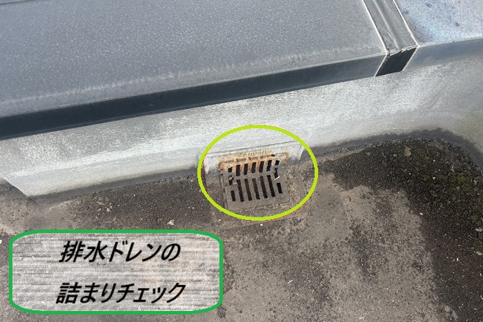 陸屋根の無料点検では、排水ドレンが詰まってないかをしっかりチェック🔍