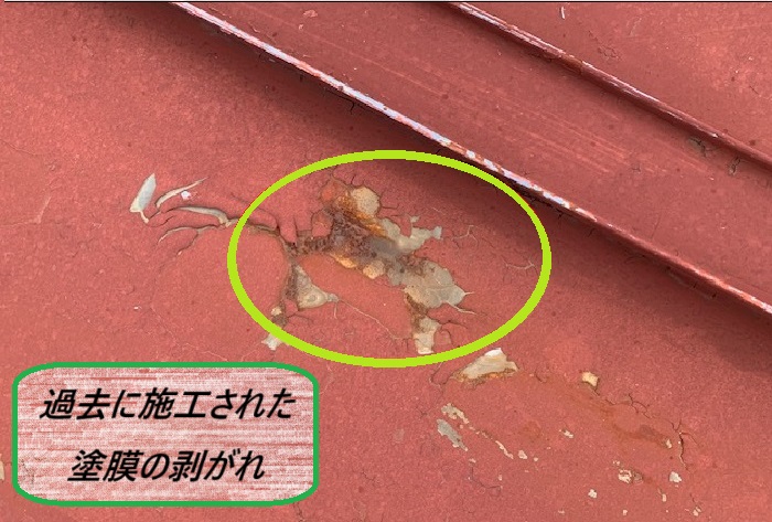 【 金属屋根の塗膜の剥がれ 】過去に塗られた塗膜が剥がれ始めている箇所を発見🔍塗膜は金属を守る大事なバリアなんですが、経年劣化で剥がれてしまうと、その部分からサビが発生しやすくなるんです。このままだと雨水が直接金属に触れて、サビや腐食がどんどん進行してしまいます⚠️