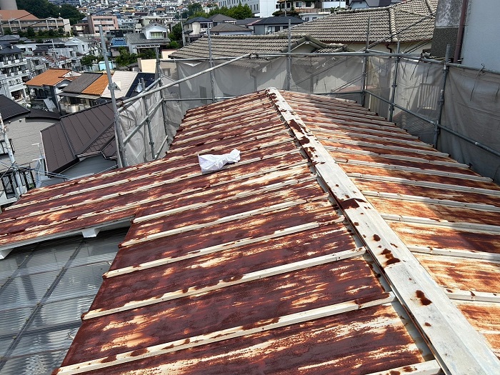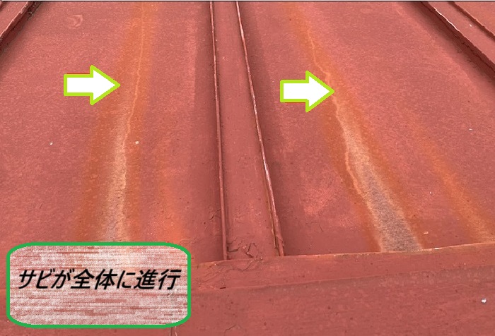 長年、風や雨にさらされてきたことで、金属屋根にサビや腐食が進んでて、修繕が必要な状態でしたよ~