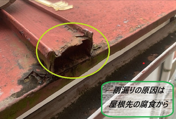【 金属屋根が腐食して雨漏り発生!】金属屋根の一部が腐食していて、そこから雨水が屋内に入り込んでいることが発覚🕵🏻腐食部分は雨が降るたびにどんどん広がっていって、雨漏りの被害も拡大してしまう可能性があります!この状態では、塗装での補修はもう難しく、本格的な修理が必要に🔧