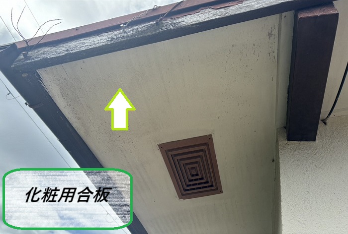 このお家の軒天には、化粧用合板(表面に木目の模様などがプリントされた板)が使われていました🔍 でも、今はその一部が剥がれてしまっている状態にX﹏X 特に屋根に近いところは剥がれがひどくなってて、湿気の影響で変色も していました。