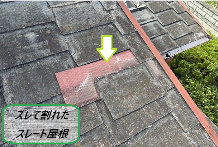 【 スレート屋根の調査 】 スレート屋根を詳しく調べたところ、長年の劣化で一部が割れていました⚡ 特に端っこのほうはヒビや欠けが目立っていて、雨水が入り込みやすい状態 に💦 このまま放っておくと、雨漏りがさらに広がって家の中の構造にも影響が出る可能性があるので、早めの修理がオススメ🎵