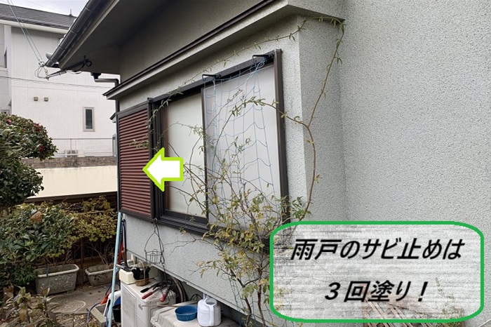 鉄製の雨戸は錆びやすいので、まずはサビ止めを下塗りして、その上からしっかり2回塗装するのがポイント⚠️
