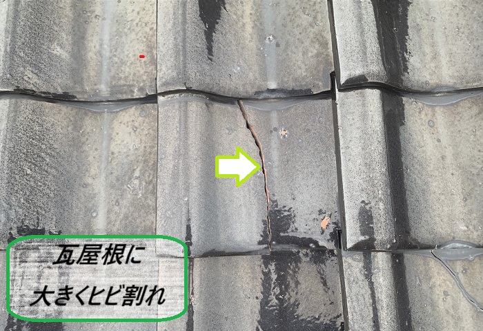 調査を続けると、なんと瓦屋根に大きなヒビ割れを発見🔍屋根の谷の部分が割れていたので、雨が降れば間違いなく雨漏りの原因になっちゃう状態でした‼