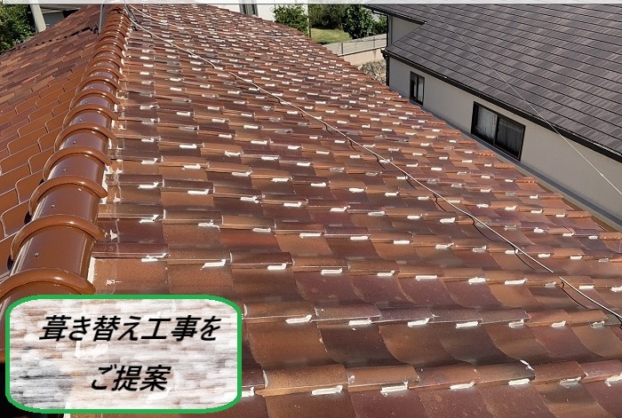 しかし、屋根全体を調べた結果、瓦自体もかなり古く、単なる補修だけでは完全に雨漏りを防ぐのは難しい状態に…☂⚡特に屋根の谷部分は、瓦の継ぎ目が多く雨水が侵入しやすいから、今回のような増築部分には、根本的な対策として葺き替えが必要になってきちゃうんです<( _ _ )>