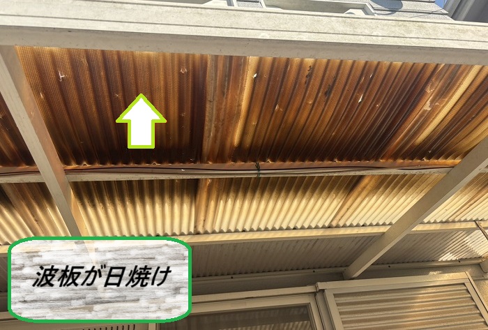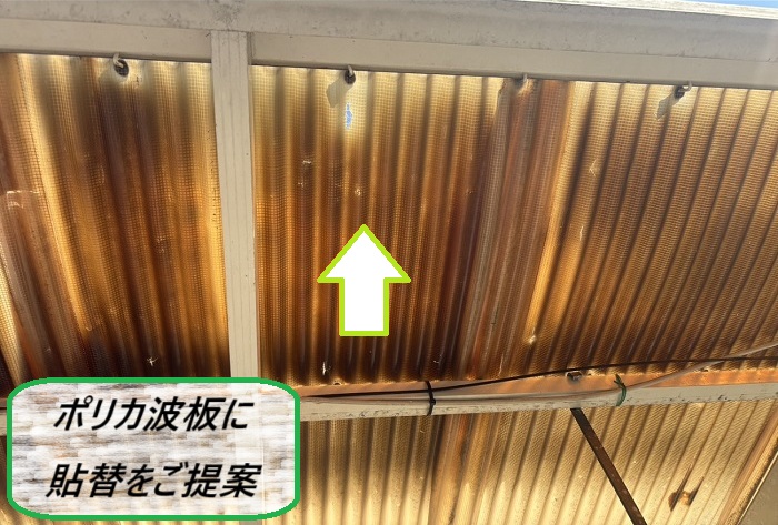 西宮市にお住いのお客様は、長年塩ビ製の波板を使用してきたために日焼けして、見た目や強度が気になってきたみたいです👂