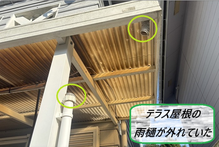 【 テラス屋根の雨樋を調査 】 テラス屋根の雨樋をチェックすると、劣化して外れちゃってる部分を発見🔍そのせいで、雨が降るたびに水がダダ漏れ…テラスの下に直接落ちちゃう状態に☔さらに、雨樋の中には葉っぱやゴミが詰まってて排水もうまくできないというダブルパンチ💥このままだと、屋根から落ちた水が地面で跳ね返って外壁が汚れる原因にもなるから、早めの修理がオススメ( •̀ .̫ •́ )