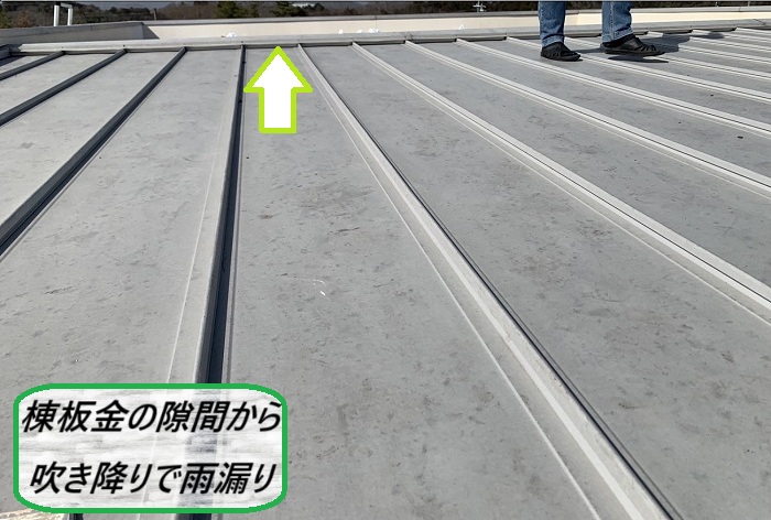 【 雨漏り原因 】 調査の結果、雨漏りの主な原因は、吹き降り時に棟部分から雨水が入り込んでいたことでした🕵立平屋根の棟は風雨の影響を受けやすくて、特に強風時には雨が横から吹き込みやすくなるんです😵💫🍃今回は棟板金の防水処理が不十分で、隙間から雨が侵入していましたよ(ㆆ_ㆆ)