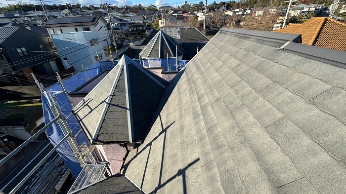 スレート屋根の表面には塗装が施されているのですが、時間が経つと塗膜が劣化してきて、色褪せが進んでしまうんです💦