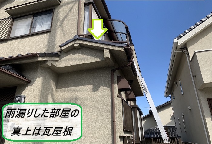 雨漏りしている室内の真上には、約3㎡ほどの瓦屋根が葺かれていました🔍場所的にも雨漏りの原因は、ほぼ確実に瓦屋根にありそう…正確に原因を調査するためには、屋根の上に登る必要があるので、ご了承ください( •̀ ω •́ )