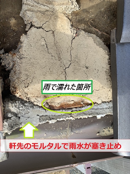 ③軒先に達した雨水がモルタル製の破風板で塞き止められる🧱