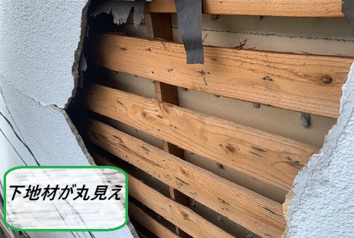 【 内部の木下地が丸見え 】剥がれた部分を確認すると、内部の木下地が完全に露出していました🔍しかも、長年の湿気や雨水の影響で腐食が進み、一部はボロボロと崩れるほどの状態に…(⊙o⊙)