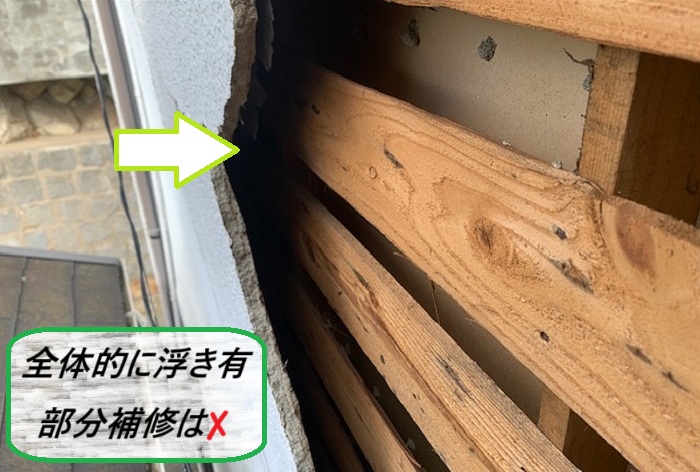 【 全体的に浮き発生 】調査を進めると、剥がれていない部分のモルタルも浮いていて、軽く手で押しただけでグラグラする箇所を数か所発見🔍この状態では、部分補修をしてもすぐに別の場所が剥がれる可能性が高いので、根本的な解決にはならないと判断しました🕵
