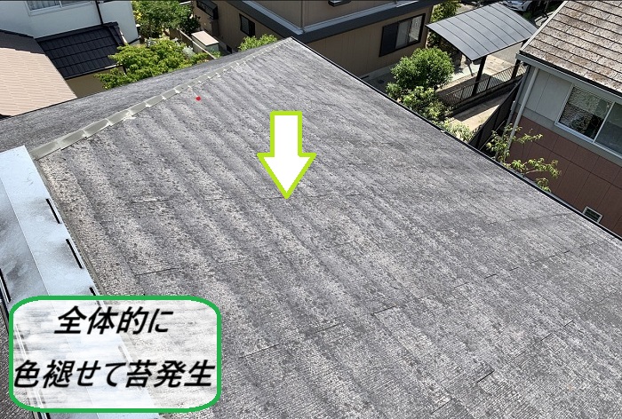 屋根を見てみると、全体的に色褪せが進んでいて、黒っぽい苔が広い範囲にビッシリ💀