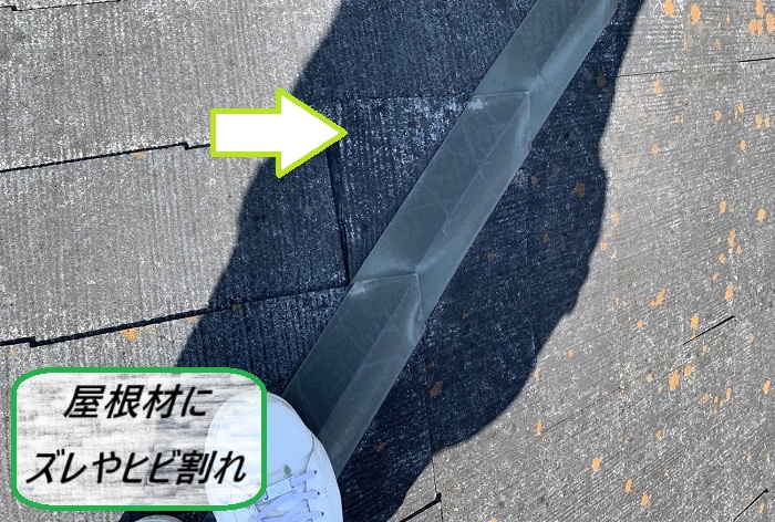 特に、屋根の端っこや棟まわりでは、小さなヒビがじわじわ広がっていて、中には完全にパキッと割れちゃってる部分も…💥