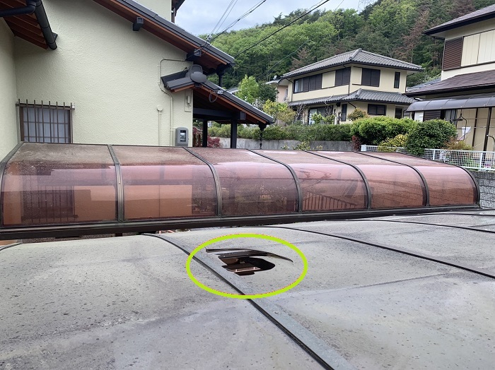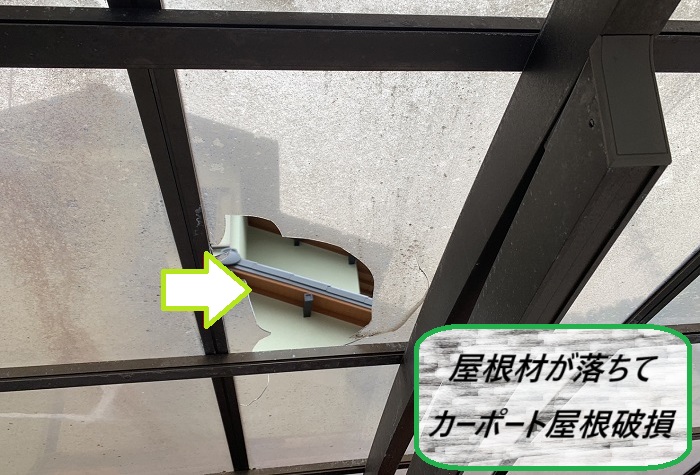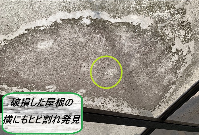 屋根材が強風で落下したことで、隣のカーポート屋根に一部ヒビ割れを発見🔍