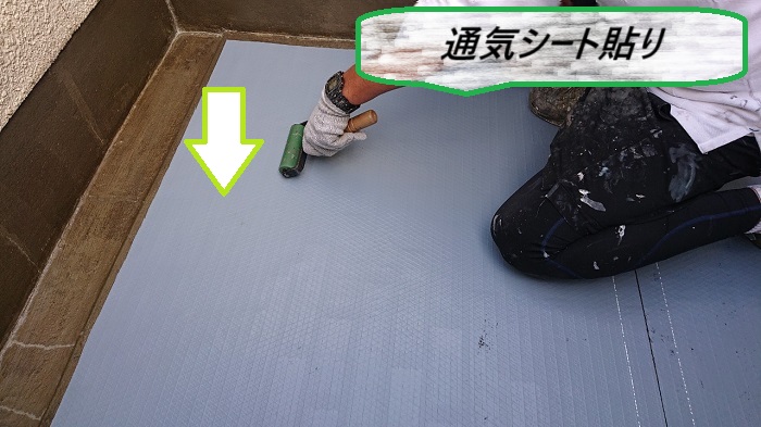まずは、下地に溜まった湿気を逃がす為に『通気シート』を敷いて、その上から液体状のウレタン樹脂を重ねていきます🔨