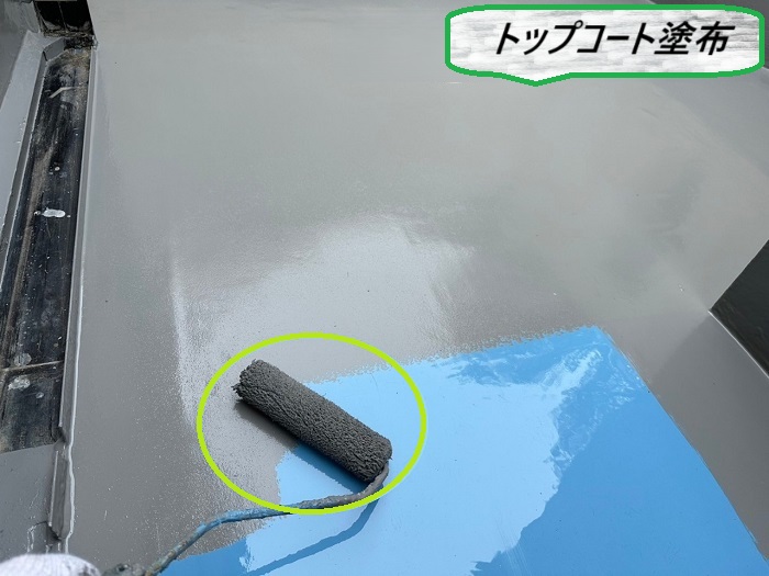 【 仕上げはトップコートで保護 】ウレタン防水通気緩衝工法の最後の仕上げは、『トップコート』の塗布🌺このトップコートには、防水層を紫外線や雨風から守る大事な役割を持っています😎外からの刺激をガードして、防水層の劣化をしっかり防止(๑•̀ㅂ•́)و✧この仕上げをしっかり行うことで、防水性能が長〜く続き、安心して使えるベランダや屋上に🎵✨キレイな見た目と機能性のどっちも守ってくれる、まさに“最後のひと塗り”です🧸💚