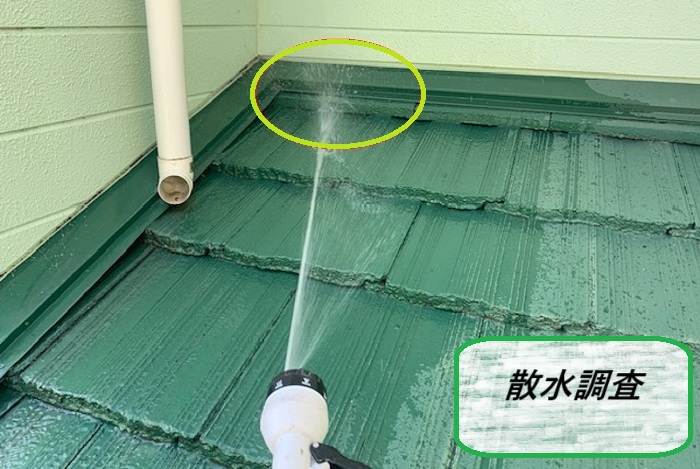 「このあたりが怪しいですね!」とお客様にも説明しながら、窓の上の外壁や瓦の隙間に集中的に散水しました🔍