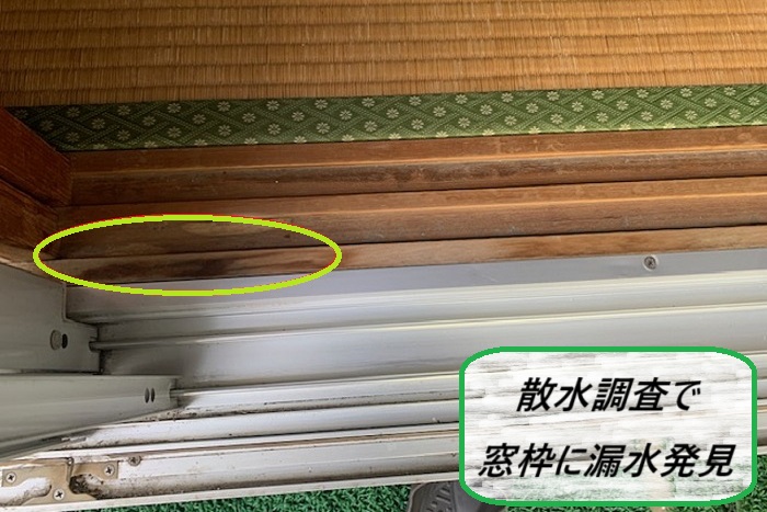 約10分ほど散水を続けたところで…ついに窓枠の上からじわじわと水が漏れてくるのを確認🔍