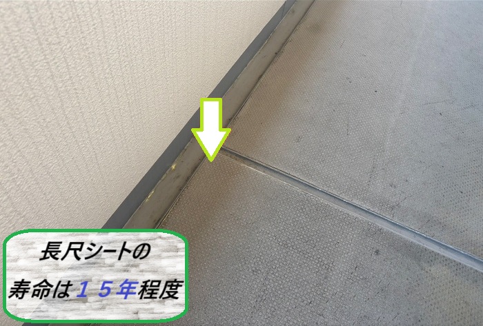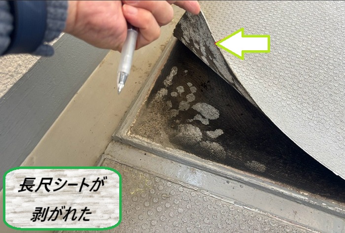 今回のように15年が経過していると、接着剤の劣化やシート自体の伸縮によって、浮きや剥がれが起きやすくなっちゃいます(˘・_・˘)