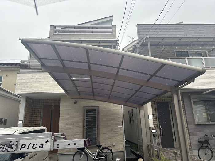 宝塚市でカーポート屋根に貼替の無料見積りを行う現場紹介(面積13㎡)