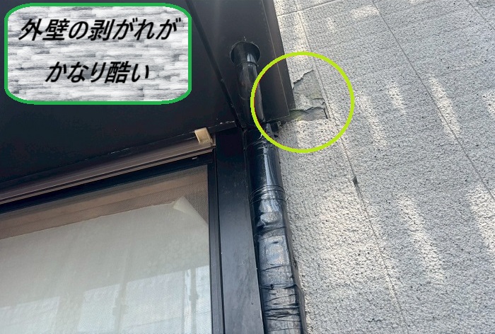 現場を確認してみると、ベランダの下あたりの外壁に、リシンの表面がポロポロと剥がれている箇所が数か所発見🔍