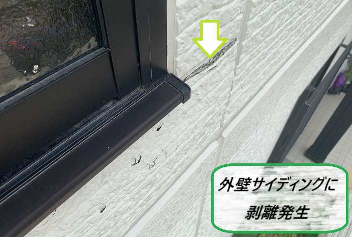 膨れている外壁サイディングをよく見てみると、雨水を受け止めるような形で外側に捲れて、剥離しているのを発見🔍