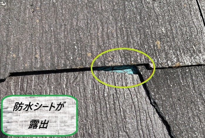 ヒビ割れから雨水が染み込んで、屋根の下地にある防水シートが劣化…