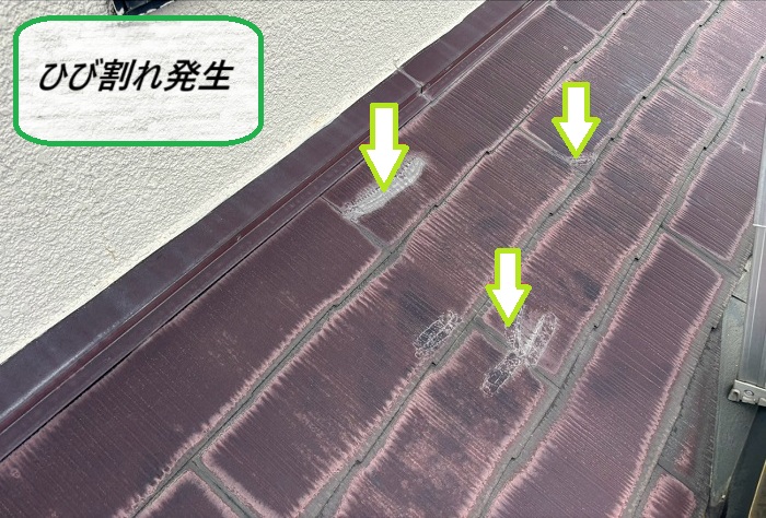 小さなヒビでも、そこから雨水が染み込み、屋根下地材(野地板)を傷める原因に⚠️
