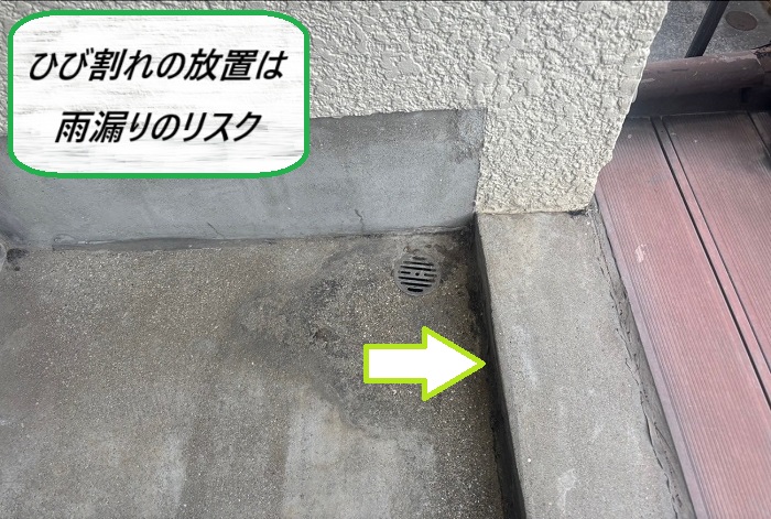 ヒビ割れがこのまま進行すると、防水層の剥離や雨漏りにつながる可能性があるので要注意⚠️