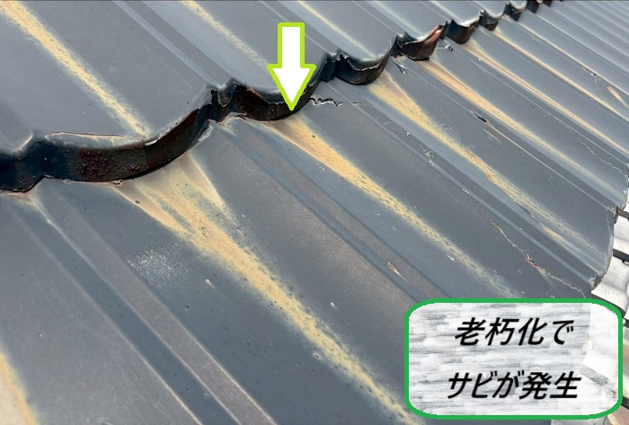 実際に現地調査をしてみると、屋根全体にサビがびっしり広がっていました(;ω;)